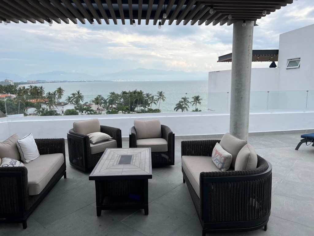 NEW! penthouse condominium with modern furnishings and stunning views of Banderas Bay. The beach is 1/2 block away! The unit has 2 bedrooms each with a king or 2 twin beds made at your request. Enjoy the tranquil views while cooking in a fully equipped kitchen, the dining table seats 6, and settle into the comfortable overstuffed furniture in the living area to watch the large smart TV or gaze at the Sierra Madre mountains. Double-paned sliding doors in the living room and bedrooms lead to a beautiful private terrace. Shared pool on the first floor. Elevator. Small well-behaved pets may be allowed. On-site security 24 hours per day.